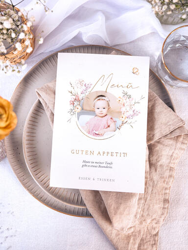 Zu einer unvergesslichen Tauffeier gehört das Festessen mit Familie, Freunden und Paten einfach dazu. Und mit liebevoll gestalteten Speise- und Getränkekarten wird die Vorfreude darauf noch größer. Wähle jetzt Dein Lieblingsdesign aus und personalisiere es {{block1}} mit den kulinarischen Highlights Deines Taufmenüs.