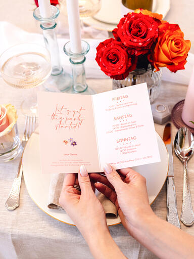 Du möchtest den Gästen gern zusätzliche Informationen zum geplanten Junggesellinnenabschied zukommen lassen? Dann lege den Print-Einladungen zum Beispiel einen schicken transparenten Einleger mit allen wichtigen Details bei. Ein Fotostreifen mit lustigen Schnappschüssen von der Bride to be steigert außerdem die Vorfreude auf die anstehende Brautparty.