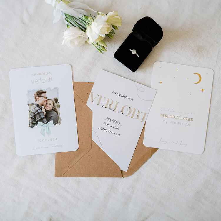 Die Frage aller Fragen wurde mit einem „Ja!“ beantwortet? Wie wunderbar! Dann ist eine Verlobungsfeier eine bezaubernde Idee, um dieses besondere Ereignis mit Euren Lieblingsmenschen zu feiern. Ob filigrane Blüten, zarte Schleifen oder charmanter Retro-Stil: lasst Euch von unseren exklusiven Papeterie-Kollektionen inspirieren und verleiht Eurer Verlobungsfeier mit einem Design-Set einen ganz besonderen harmonischen Look.