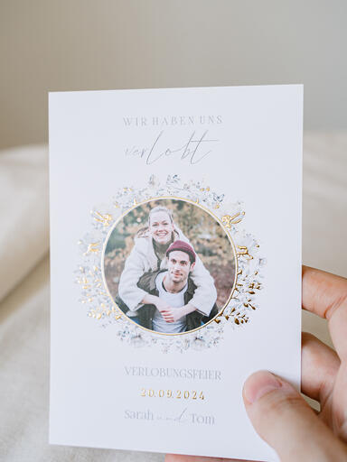 Wählt für Eure Verlobungskarten aus unseren {{block2}} Euren Favoriten. Neben unserem klassischen matten Feinpapier stehen auch das elegant strukturierte Büttenpapier, Sirio Pearl mit zartem Perlmutt-Schimmer oder ein Premiumpapier mit Hochglanzbeschichtung zur Auswahl. Für das gewisse Etwas könnt Ihr Eure Karten zusätzlich mit einer {{block1}} veredeln lassen. Von der Einladung über die Tisch- und Menükarten bis hin zu den stilvollen Tisch-Sets verleiht Ihr der Papeterie rund um Eure Verlobungsfeier somit ein unverwechselbares Aussehen.