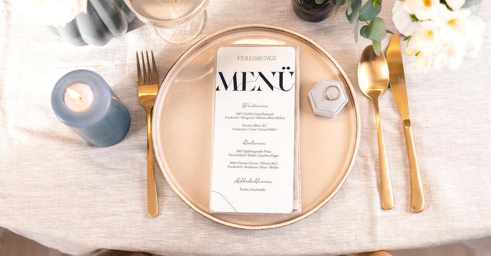 Ihr habt ein Buffet oder mehrgängiges Menü für Eure Verlobungsfeier geplant? Zaubert elegante Menükarten und präsentiert den Gästen auf sehr stilvolle Weise alle angebotenen Speisen und Getränke.