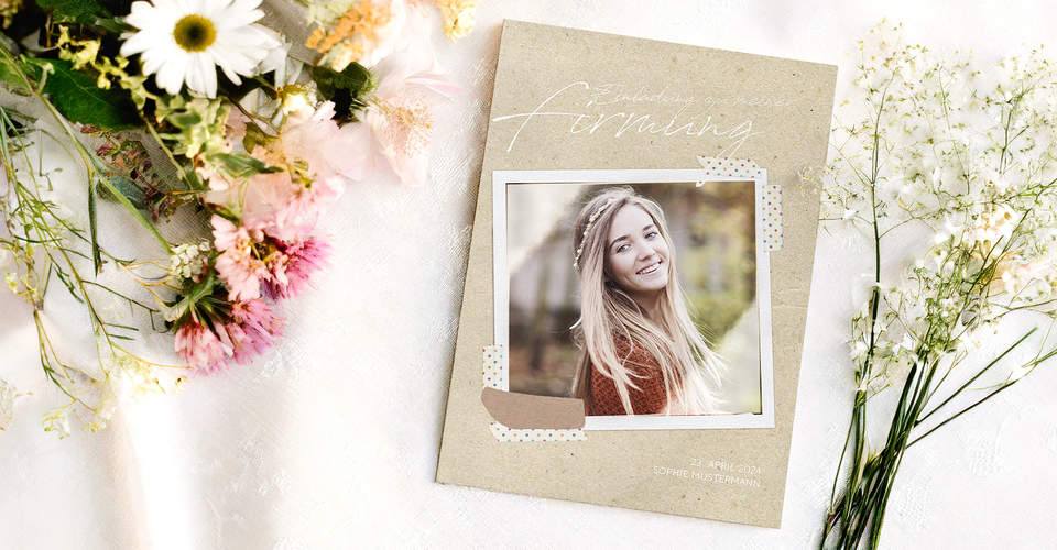 Bei den Einladungskarten für die Firmung werden üblicherweise sakrale Symbole wie Kreuz, Fisch oder Taube verwendet. Genauso kannst Du aber ein schlichtes Design aus Blüten, Blättern und Sprenkeln wählen. Die eingeladenen Gäste freuen sich auch immer über ein Foto des Firmlings.
