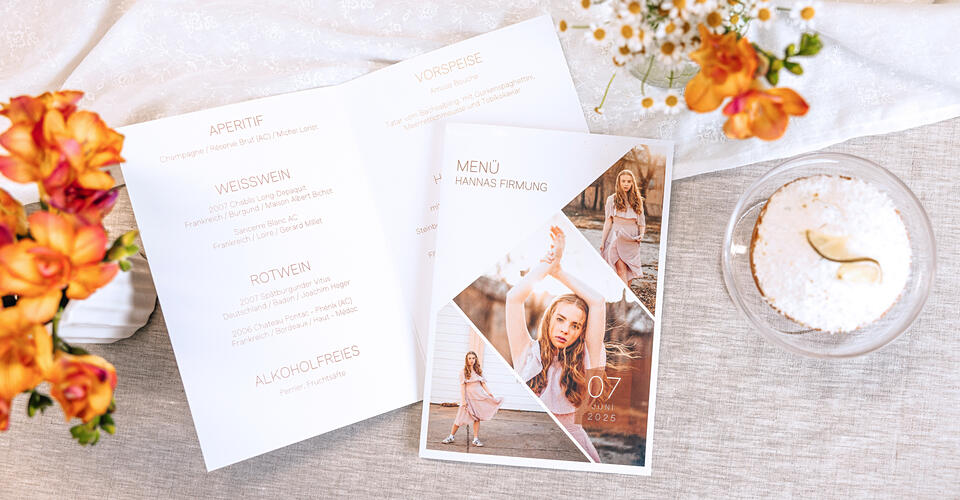 Menükarten bieten Deinen Gästen auf der Firmfeier nicht nur eine hilfreiche Übersicht über alle Speisen und Getränke, sondern verleihen der Festtafel gleichzeitig das gewisse Etwas. Wähle jetzt ein Motiv passend zu Deiner Feier und personalisiere es einfach und bequem online.