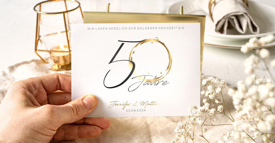50 gemeinsame Jahre, Seite an Seite: Feiert diesen großartigen Moment mit allen Menschen, die Euch auf diesem Weg begleitet haben und ladet sie herzlich zu Eurer Goldenen Hochzeit ein.