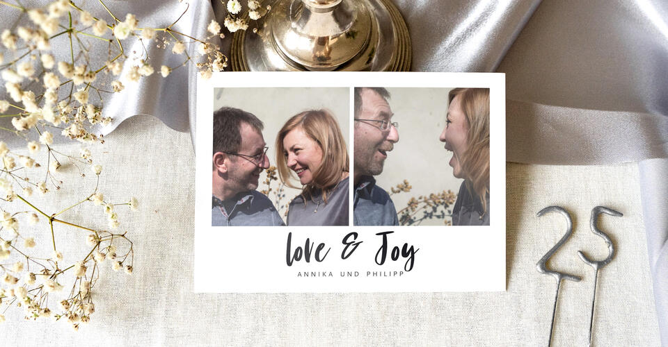 Wählt jetzt ein Design aus, das Euch gefällt und personalisiert es zum Beispiel mit Euren Namen, den Eckdaten der Feier und als kleines Highlight für die Empfänger:innen auch mit Euren Fotos von damals und heute.