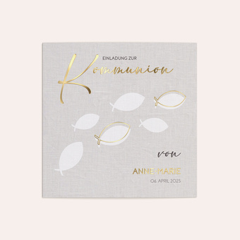 Bei Deinen Kommunionseinladungen kannst Du Dich für jedes Design entscheiden, das Du für Dein Kind und den Anlass passend findest. Am häufigsten wählen Eltern das Motiv "Fisch" oder "Kreuz". Gern werden auch "Sprenkel" oder "Blätter" genommen.