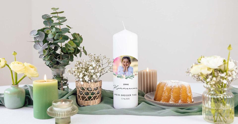 Ob als Teil der festlichen Kirchenzeremonie, als stimmungsvoll leuchtende Deko auf der Feier oder aufmerksames Gastgeschenk für das Kommunionkind: mit einer selbst gestalteten Kommunionkerze liegst Du immer richtig. Stöbere durch unsere brandneue Kommunionkerzen-Kollektion mit vielen modernen sowie klassischen Motiven für Mädchen und Jungen und personalisiere im Handumdrehen Deinen Favoriten.