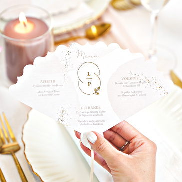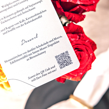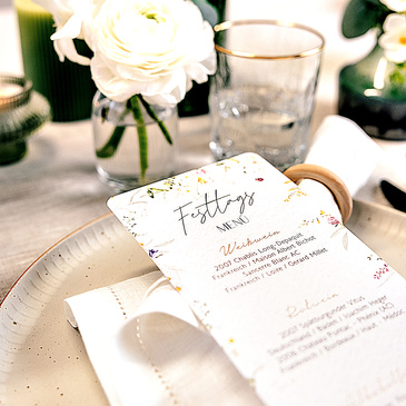 Hurra, Ihr sagt Ja und feiert mit allerlei Köstlichkeiten Euer gemeinsames Glück. Selbst gestaltete Menükarten verleihen Eurem Festmahl das gewisse Extra und verraten auf charmante Weise, welche kulinarischen Highlights auf Eure Gäste warten. Mit unseren kreativen Designs und abwechslungsreichen Formaten verwandelst Du Deine Speise- und Getränkeauswahl im Nu in ein kleines Kunstwerk – auf Wunsch sogar mit kostenlosem digitalem Fotoalbum zum Bilder sammeln und teilen.