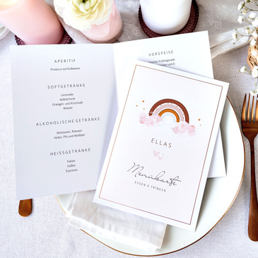 Bedeutende Feiern Deines Kindes planst Du mit ganz viel Liebe zum Detail – von der Menüfolge bis zum feierlich dekorierten Tisch. Möchtest Du Deine ausgewählten Leckereien richtig schön in Szene setzen und zusätzlichen Glanz auf Deine Festtafel zaubern, sind personalisierte Speise- und Getränkekarten die perfekte Wahl. Unsere von Hand entworfenen Vorlagen in den verschiedensten Stilrichtungen kannst Du online ganz nach Deinen Vorstellungen mit eigenen Bildern und Texten gestalten.