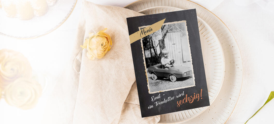 Ob runder Geburtstag, Cocktailparty mit Fingerfood-Buffet oder Weihnachtsdinner im kleinen Kreis: jedes unserer originellen Menükarten-Motive kannst Du im Handumdrehen für Dein persönliches Event anpassen. Du hast eine ganz besondere Idee für Deine Feier? Dann wähle einfach eine Blanko-Menükarte in Deinem Wunschformat, lade schnell und bequem Dein eigenes Design hoch und lass Deine Speise- und Getränkekarten professionell von uns drucken.