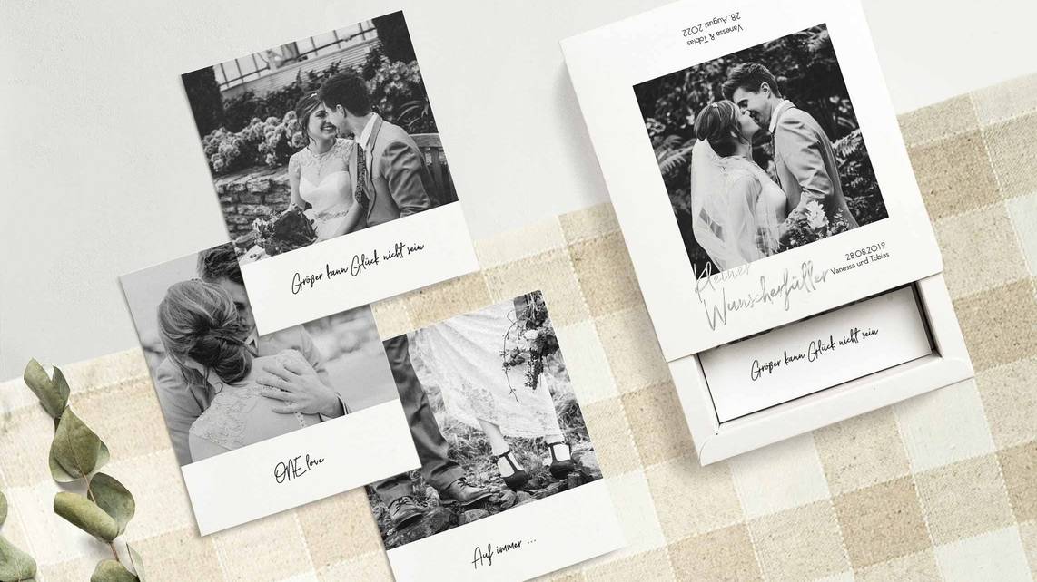 Verleiht Euren Lieblingsfotos einen tollen Rahmen, zum Beispiel in Form einer hochwertigen Holzbox mit edler Gravur. Die Fotos werden zudem in einem schönen und zur Silberhochzeit passenden Retrostil gefertigt. Hier findet Ihr eine Auswahl an stilvollen Designs zum Personalisieren.